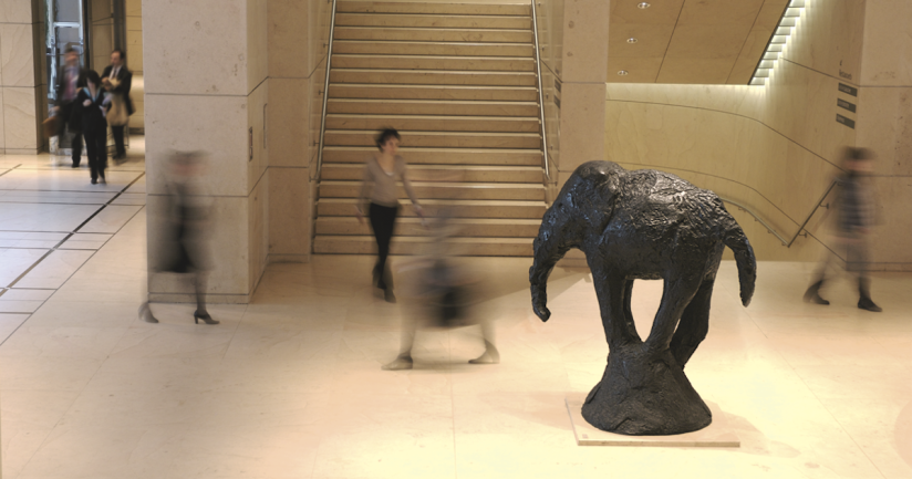 Réalisée en 1986, c’est l’une des pièces emblématiques de la Collection Société Générale. Œuvre de l’artiste gallois Barry Flanagan, connu pour ses réalisations animalières, cette sculpture en bronze de deux mètres de haut représente un petit pachyderme d’Asie dans une posture fantaisiste, s’offrant au regard des passants. Avec sa trompe trop courte, ses quatre pieds mis en un seul, son dos fuyant, complètement incliné, l’Éléphant présente des contours incertains qui allègent son allure et lui donnent un petit air de ballerine.